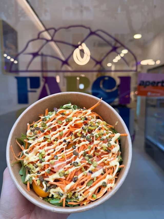 - Misticanza, tartare di salmone, mozzarella di gioia del colle DOP, carote, datterino giallo, maio al lime, granella di pistacchio