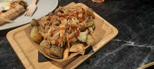 - Pulled pork al BBQ, cheddar fuso, guanciale croccante e crema di patate