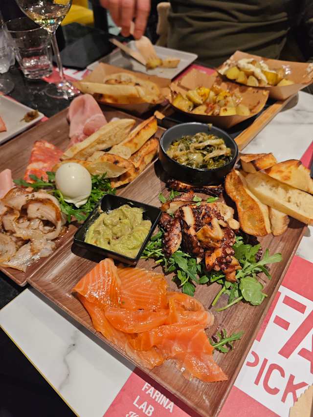 - Polpo rosticciato con olive e pomodorini, guacamole, salmone marinato a secco, rucola, scarola ripassata con capperi e olive.