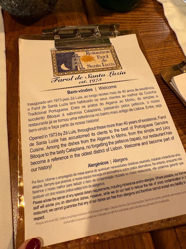 10/10We really enjoyed our meal at Farol de Santa Lucia. Probably the best meal we have had during our stay in Lisbon. Would definitely recommend but make sure you book!