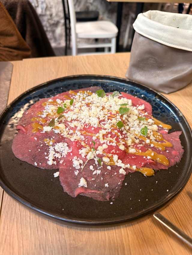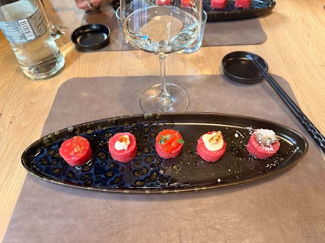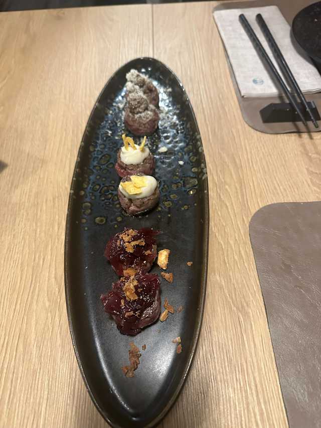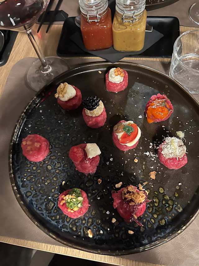 8/10We read the reviews and thought this was a «must try» but was disappointed. We took the owners recommendation, set menu 90 euros for 2 people sharing. The meat sushi rolls were innovative and tasty. The beef tartar pieces were heavy. The meatballs were not exciting. If you go, I recommend ordering the meat sushi rolls off the menu. I prefer a steak to hamburger beef, and unfortunately we were served too much hamburger beef here.
