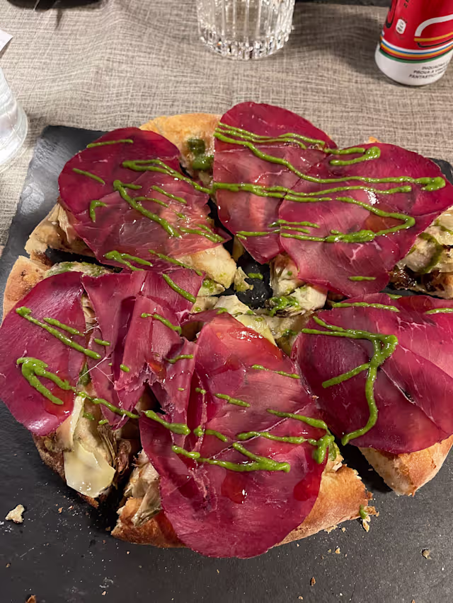 - In cottura: blu di pura capra, carciofi grigliati, hummus di rucola. Dopo cottura: bresaola, olio evo del garda al limone.