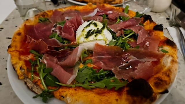 Tomate, mozzarella, speck, cèpes, provolone et huile d'olive.