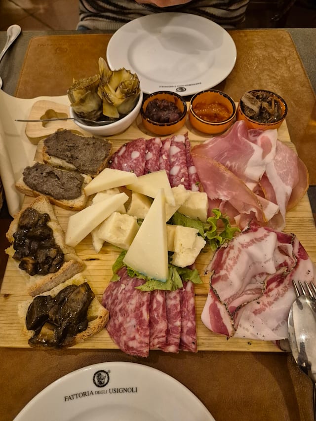 4.5/10Fattoria Degli Usignoli was disappointing in every way - I'm really surprised that The Fork gives them a high rating because it was one of the worst dinner experiences I've had in the 6 years I've lived in Tuscany. The food quality was terrible, the restaurant is extremely loud, the food is overpriced and there was a 20% service charge added onto our bill (for a table of 2), which is absolutely unheard of here in Italy. 4 employees were either near us or walked by us standing at the reception for a full 10 minutes without greeting us or letting us know in any way that someone would come to seat us. No one responded until I asked if we were waiting in the right place, and then we waited some more. The place is LOUD - it serves a tour bus clientele, and there were two bus loads of people eating dinner. The dishes we ate ranged from okay to terrible. The side salad consisted of sad yellowed iceberg lettuce with three cherry tomatoes cut in half, We left as soon as we ate 3/4 of our meal because we couldn't hear our own conversation. Again, we waited at the till while employees walked by without acknowledging that we were waiting there. The woman who finally rang up our bill neither greeted us when she finally came to the till, looked at us, asked how the food was, or even indicated that she was aware of our presence until she wordlessly handed me the bill. The Fork discount was there, but for a terrible meal of one pasta, one pizza, a side salad and two appetizers (they were the only decent thing we ate), and 2 glasses of house white, the bill came to €60. Note that there was a €5 cover for each of us = €10 total - this is double what any other restaurant charges for service. While our waiter was decent once we sat down (the only reason I gave 3 stars his service only), but the staff service in general was awful). This place needs a simple customer service training for all their employees, especially since they're catering to tourists. The only worthy characteristic about this place is the gorgeous setting - the rest was hugely disappointing. There are so many good restaurants here in Tuscany; find another one.