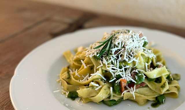 - Pici al Ragù dell'Aia, Pesto di Basilico e Ricotta Salata