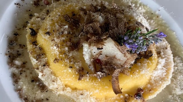- Raviolone Pecorino, Pere e Pepe Rosa