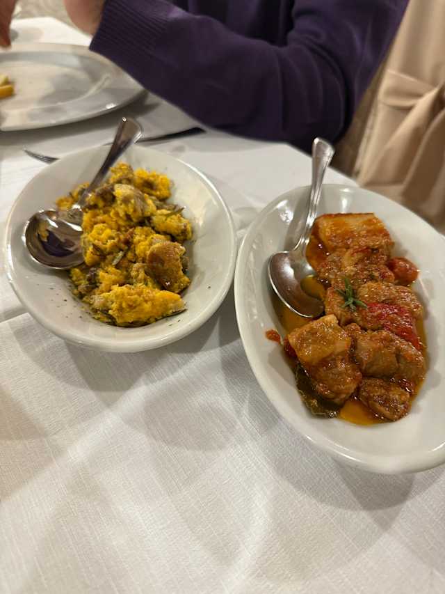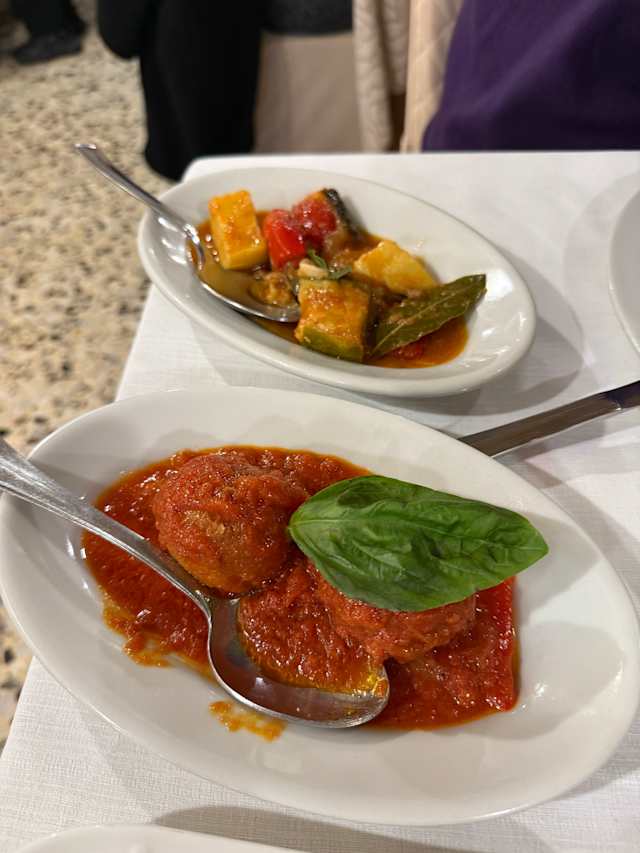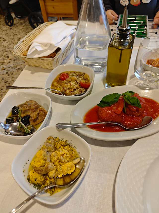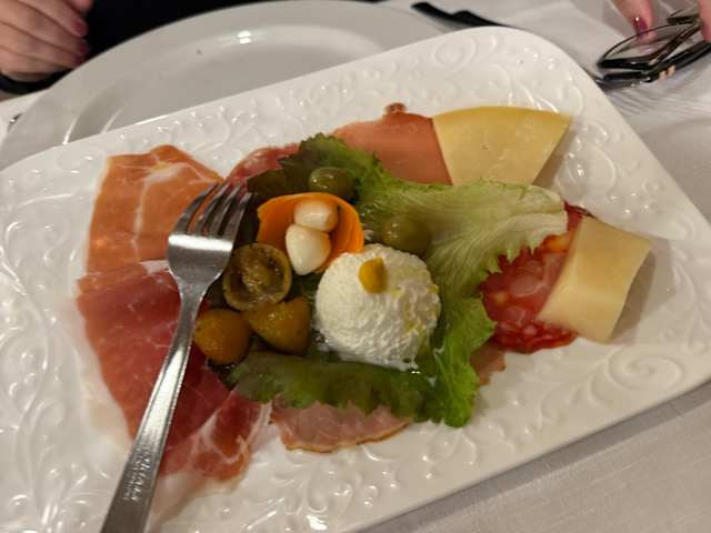 Salumi misti con formaggio pecorino e quattro portate di antipasto caldo.