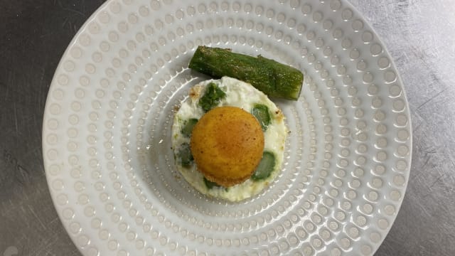 Mozzarella con un cappotto di coppa di maiale croccante su una spuma di pomodorini datterini di pula