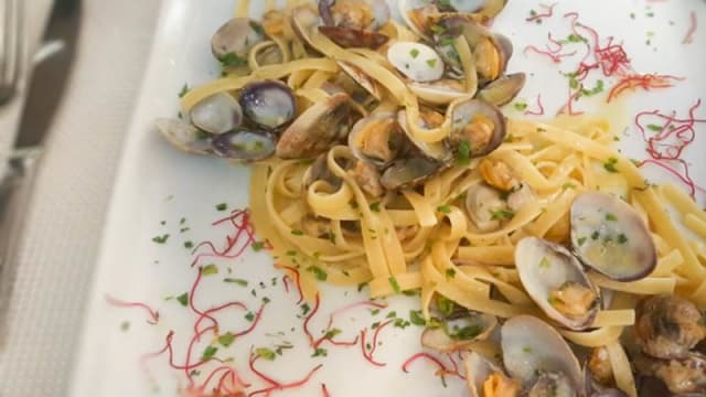 Le nostre tagliatelle fresche su salsa di parmigiano tartufato e vongole locali