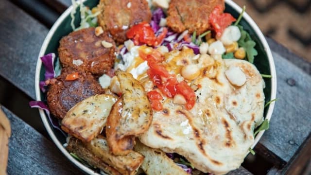 Falafels, yaourt épicé, patate douce rôtis, cheddar mâture et pickles.