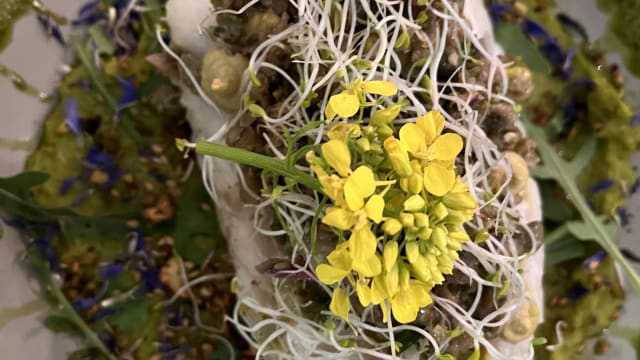 Artichauts en barigoule traditionnelle, polenta frite, crémeux de fêta, pickles de citron jaune et sichuan, pousses de moutarde croustillante.