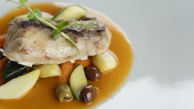 - Baked sturgeon – potatoes – artichokes – plum umeboshi sauce