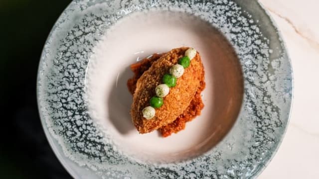 Pan brioche soffice in versione salata, farcito con gambero marinato agli agrumi calabresi, avvolto dalla cremosità della stracciatella e completato da una coulis di lamponi. Un equilibrio sorprendente tra mare, freschezza e acidità fruttata, per un morso elegante e vibrante.L