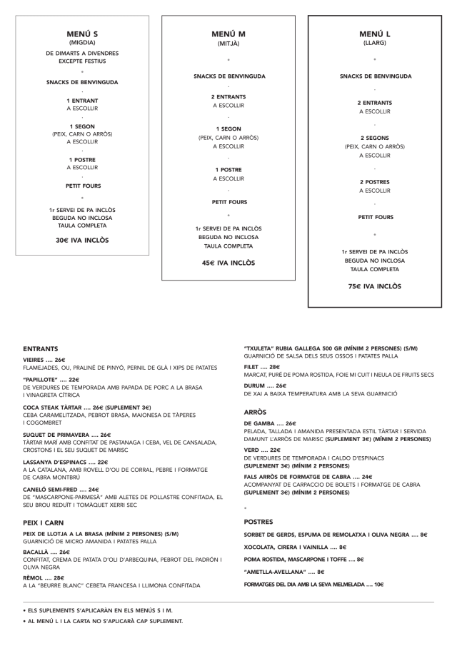 9.5/10Excellent meal, three different set menus that allow you to select dishes from the a la carte menu. Every dish we had was well thought out and made use of locally sourced ingredients. The service was extremely good and our waiter was very knowledgeable and spoke Catalan, Castilian and English perfectly. Looking forward to returning when the menu changes for the winter season, as we were told that the menu changes four times a year.