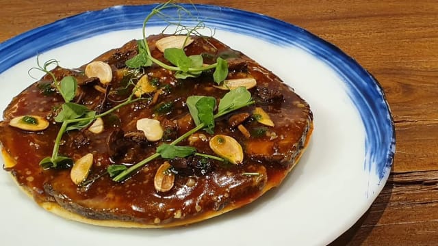 - EN TATAKI CON BERENJENA A LA BRASA, CREMA DE AJO, PIQUILLO Y PEREJIL