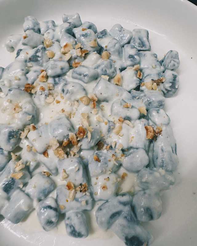 - Bufala DOP, pomodoro confit, spaghetti di patate, gamberi scottati*, pepe rosa, fiori edibili.