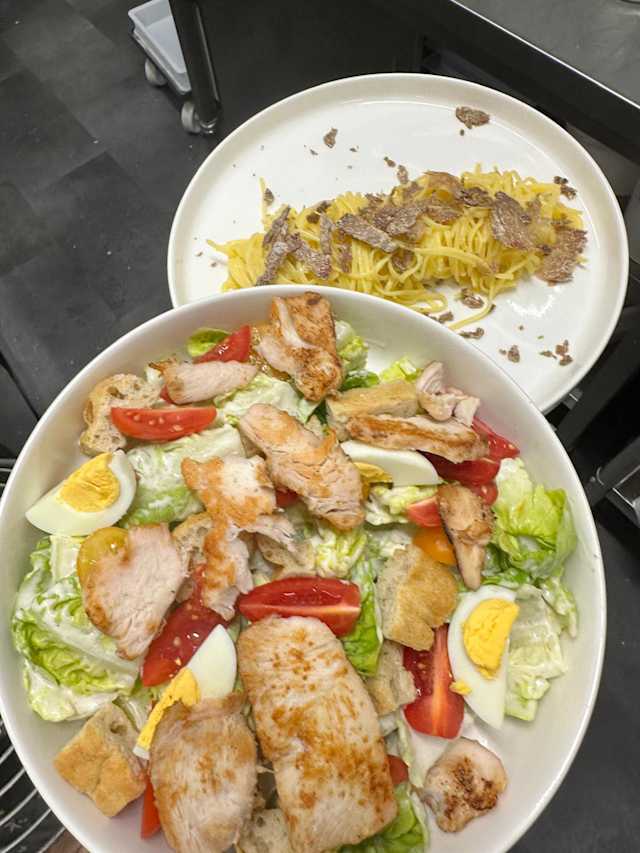 - Insalata verde con dressing a base di yogurt accompagnata da crostini di focaccia, parmigiano, pomodorini, uova sode, a scelta: pollo o gamberi