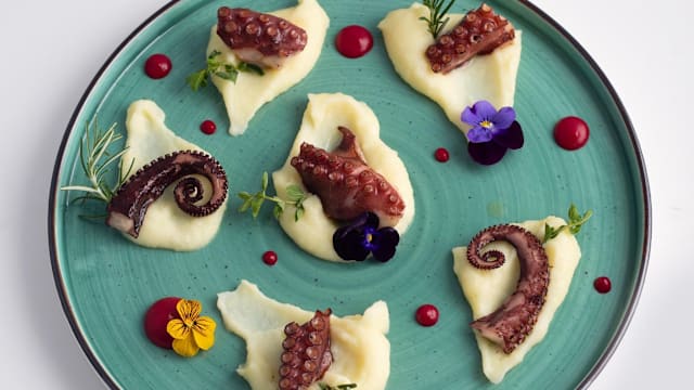 - Polpo all'elbana con purè di patate alle erbe aromatiche