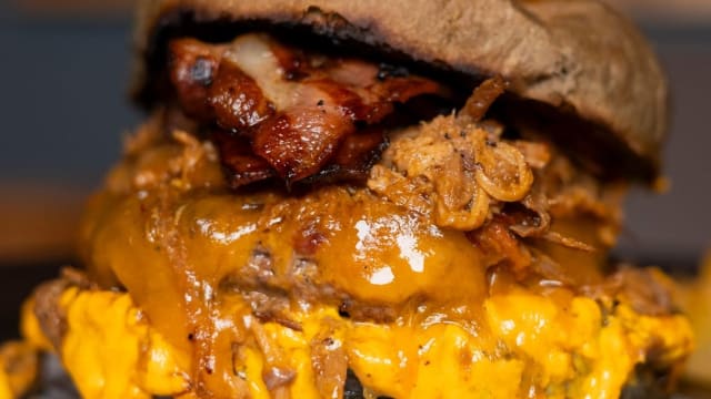 Pane nero, hamburger di scottona 200gr, cheddar ,pulled pork ,bacon,fonduta di cheddar