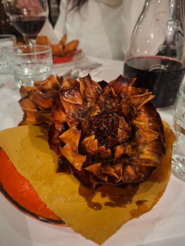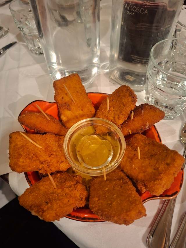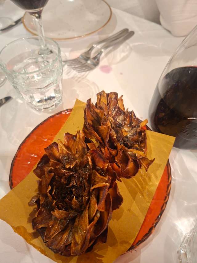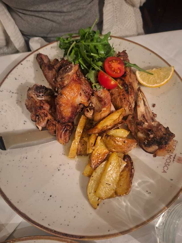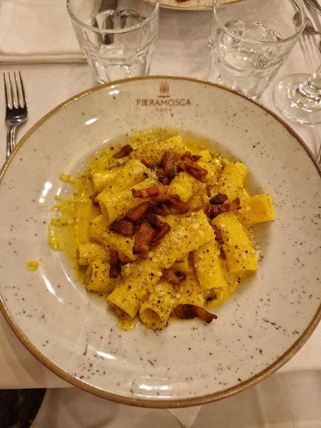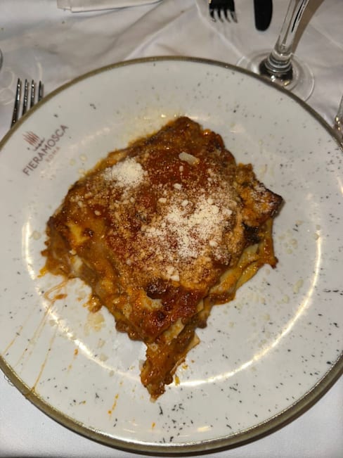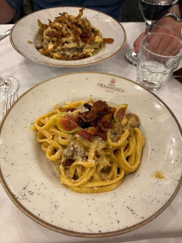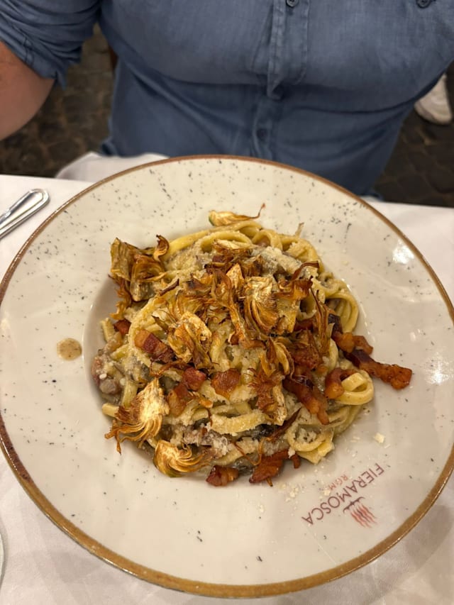 8/10We often think the food in these big restaurants is inferior to small ones. This is not true at Fieramosca (and others) where the dishes are true Italian and especially Roman. These are almost always excellent examples of local cuisine without aspirations to grandeur. The ambiance is fun and the beauty of an old building enhances the feeling. Staff are friendly and as attentive as a large crowd can allow. They happily found dishes for my vegan diet companion, my grilled octopus was perfect. And the cost was very reasonable.