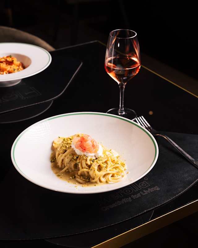 - Spaghettone di gragnano con pesto di pistacchio, stracciatella e tartarre di gambero rosso
