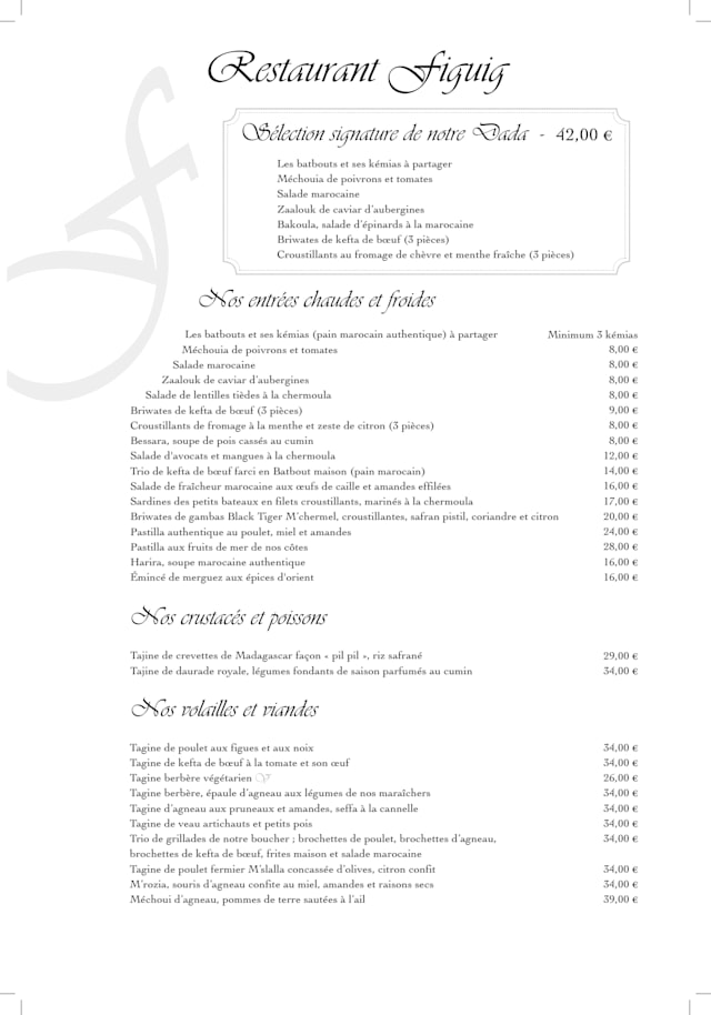 10/10What an incredibly unique and flavorful dinner! Everything was served hot, fresh and delicious! We had the appetizer sampler, prawn tanjin and lamb tanjin. If we lived closer than 4,000 miles away from this restaurant we’d come back every month. What a find. My wife dragged me to every Instagram famous restaurant in Paris, but I picked this one and we both agreed that Figuig was our favorite!!