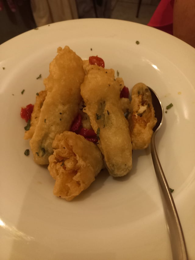 Fiori di zucchina ripieni di ricotta e menta e pomodorini confit