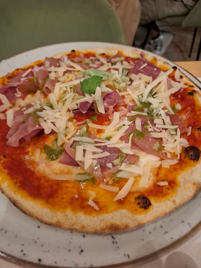 Salsa al pomodoro san marzano DOP, mozzarella di bufala gioiella, prosciutto di parma, parmigiano reggiano 24 mesi e pesto di basilico