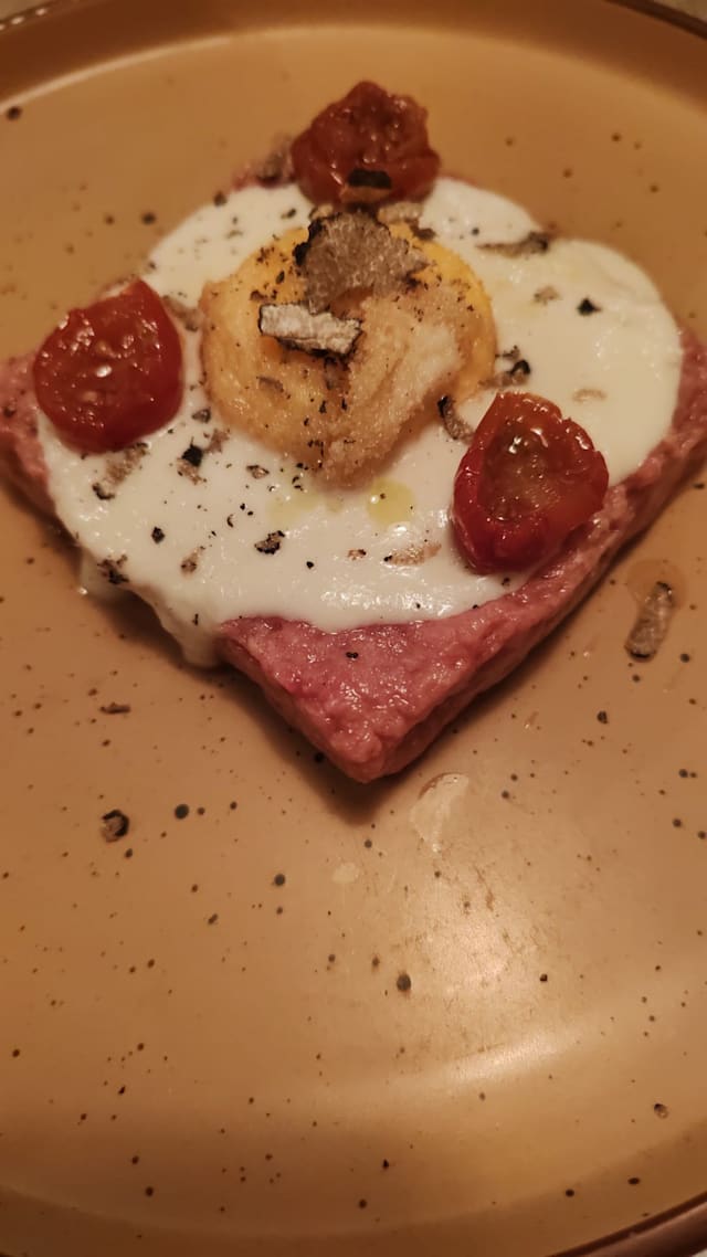Fassona con crema di pecorino, pepe nero, fior di cappero e pomodorino confit