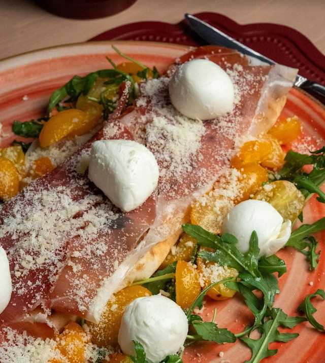 - Rotolo di pizza con interno di fior di latte di agerola, emmental. In uscita: rucola, prosciutto crudo di parma doppia corona, datterini gialli, ciliegine di bufala campana DOP, parmigiano, basilico, olio evo.