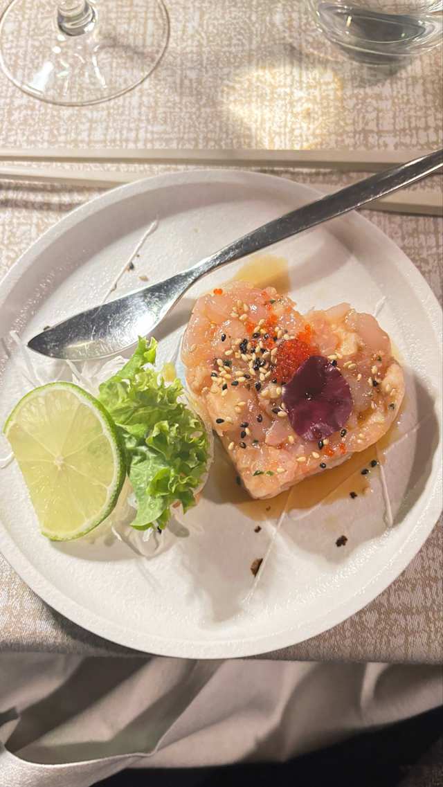 - Tartare di salmone con ikura, erba cipollina, sesamo, maionese, salsa ponzu e tabasco