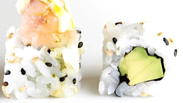 - Gambero in tempura, mayo orientale e avocado avvolto da salmone scottato e concassè di pomodorini