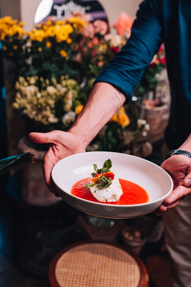 Battuta di manzo, stracciatella, melograno, pane alle alici ( 130 g)