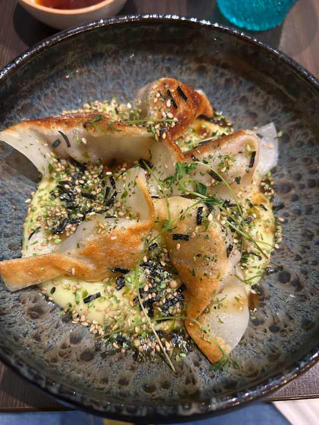 - Gyoza ripieni di capasante e tartufo nero pregiato, barba dei frati e fondo al tartufo