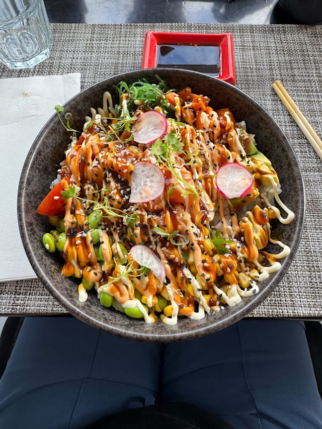 Panko fatia de tofu revestida, arroz japonês, molho suave de caril, legumes em cubo