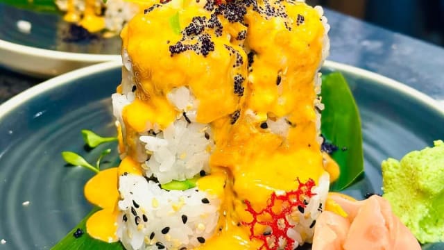 Barriga de porco crocante, kimchi, molho, ovo, soja, limão, milho