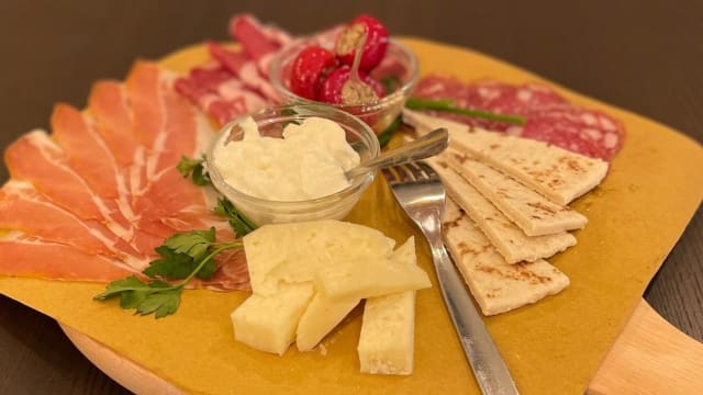 Crostini misti, selezione di affettati, formaggio stagionato e squacquerone