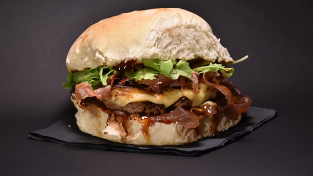 Hamburger con salsa alla menta, rucola, pomodori secchi e scaglie di parmigiano