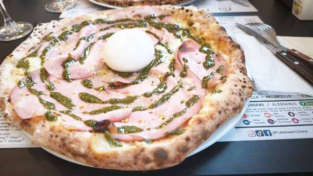 - Base blanca de fior di latte, scamorza, pecorino romano, guanciale, rovell d'ou i pebre negre
