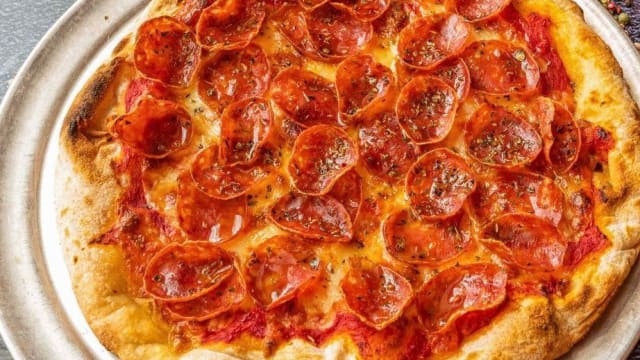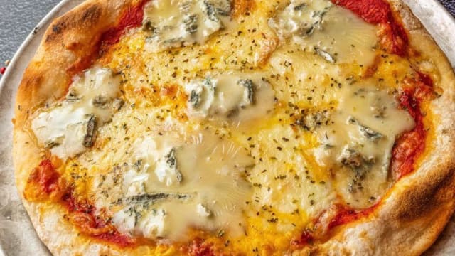 Sauce tomate, mozzarella fior di latte, buche de chèvre, miel_