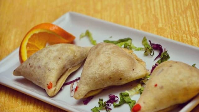 Panzerotto indiano ripieno con patate, piselli e frutta secca