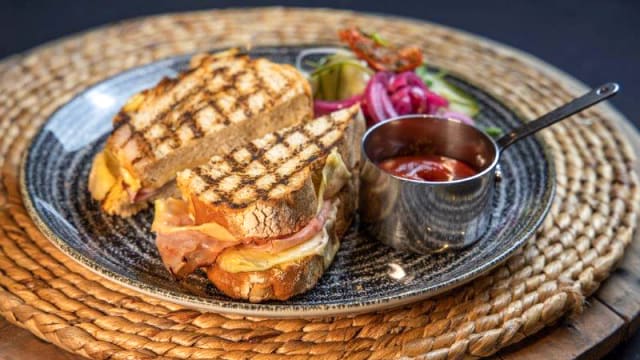 100% Runderburger op een brioche bol met tomaat, zoetzure augurk, krokante uienringen en cajunsalsa