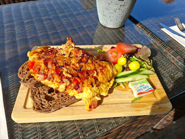 Gegrilde kip | spek | gekookt ei | grana padano | romaine sla | ansjovis caesar dressing. Geserveerd met brood en boter