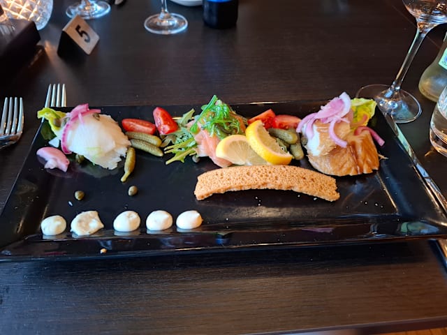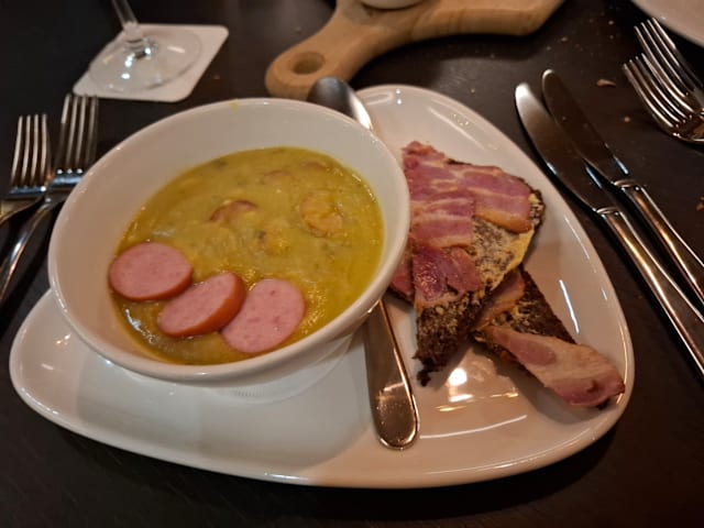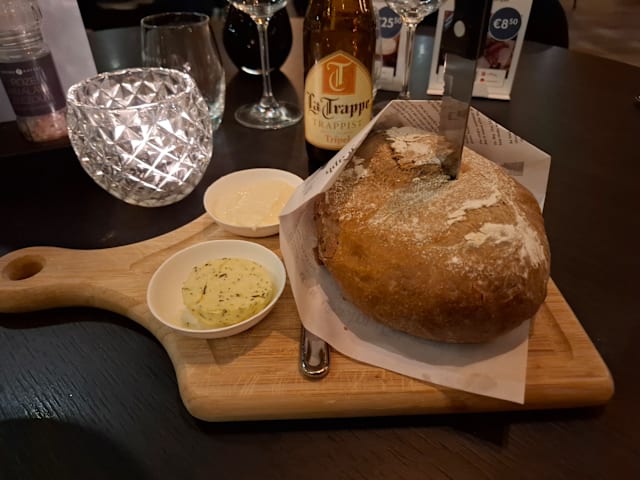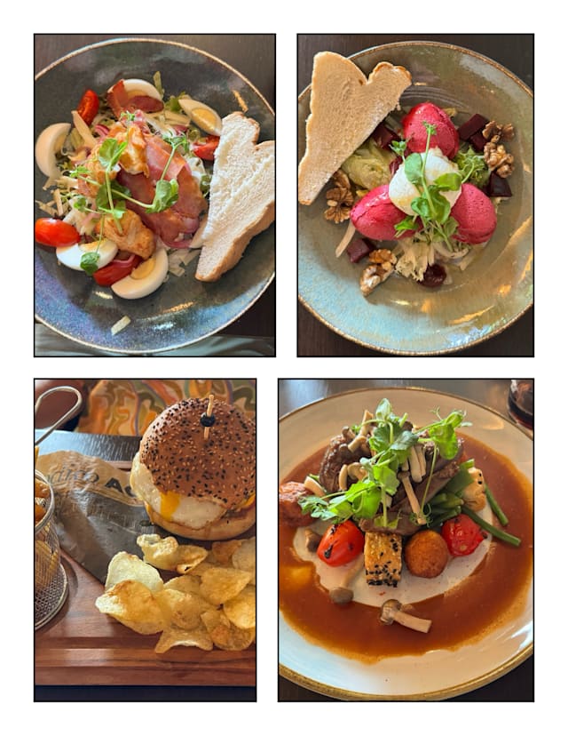 Mesclun sla | gegratineerde geitenkaas | honing | rode biet | walnoten. Geserveerd met brood en boter