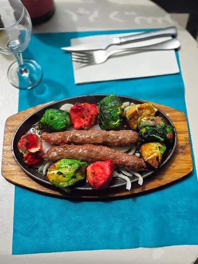- Pollo tikka, hamburguesa de peshawar, humus, arroz basmati y pan de trigo