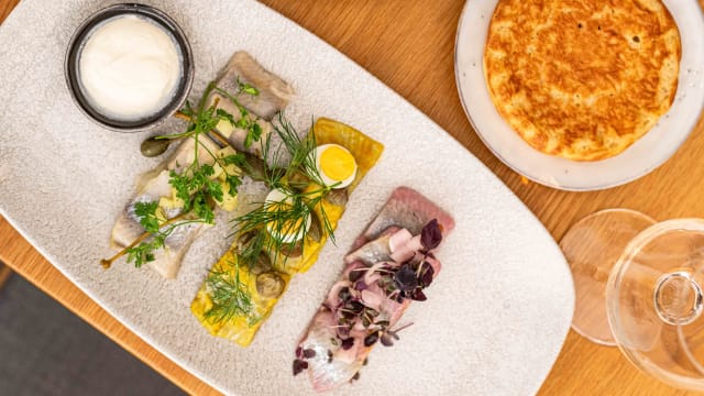 - Saumon fumé bio / saumon mariné à l’aneth "gilbert bécaud" / assortiment de harengs / saumon fumé à chaud / pommes de terre à la crème de raifort / blini maison