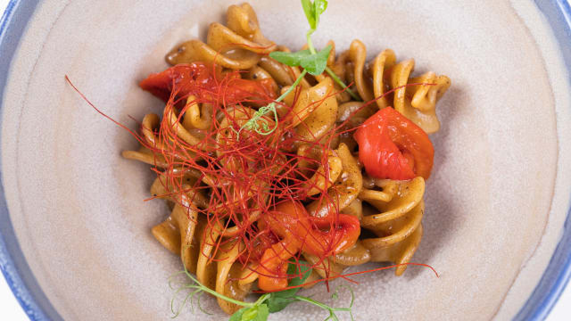 Spaghettone al nero di seppia, estratto di gambero tartare di gambero crudo e finger lime