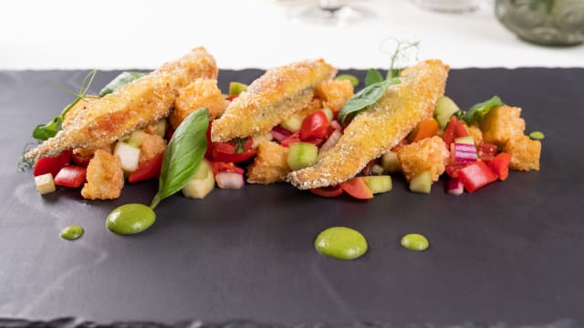 Pappa al pomodoro resa croccante, accompagnata da fonduta di pecorino e coulis di pomodoro datterino affumicato