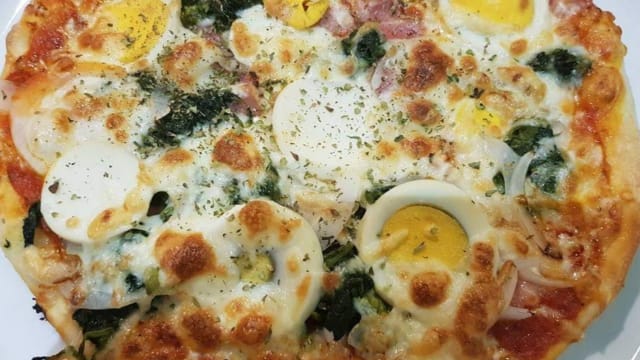 (Molho de tomate,natas,gambas,fiambre, cogumelos,ovo cozido e queijo gratinado)