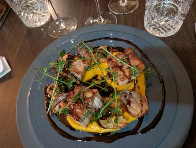 - Poulpe grillé, purée de chou fleur et crémeux de piquillos marinés au soja